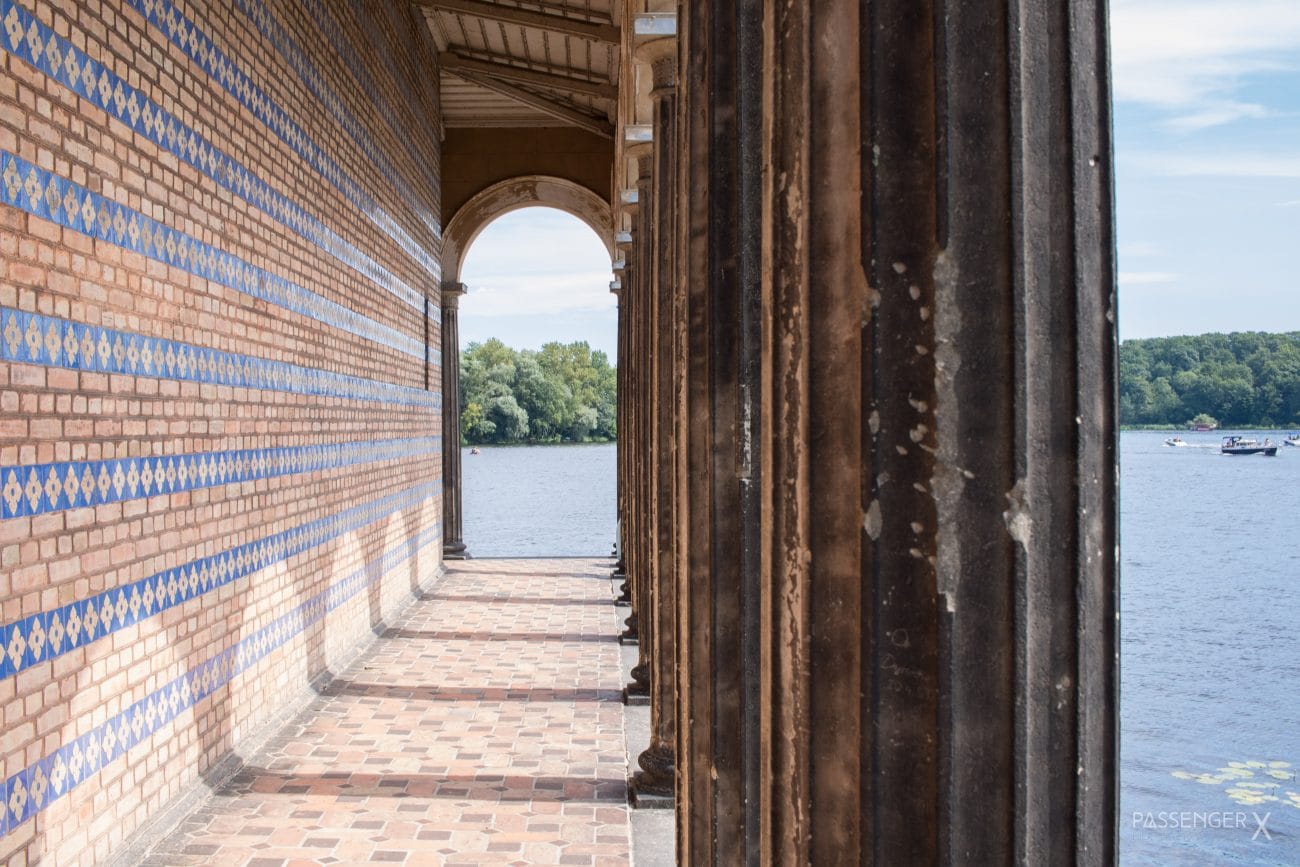 Weiter geht es zur Heilandskirche Sacrow. Hier gibt uns das Ufer sogar die Möglichkeit anzulegen und eine Pause zu machen. Geschnittene Wassermelone, Brötchen und Limo haben wir dabei und genießen wir nun angelehnt an die Säulen der Kirche mit Blick aufs Wasser – so lässt sich das Leben doch gut aushalten. Vom aufkommenden Wind angetrieben ziehen immer mehr Segler vorbei. Auch Motorboote sind reichlich unterwegs. Alle wollen sie das seltene gute Wetter nutzen. Wir schauen dem Treiben eine Weile zu.